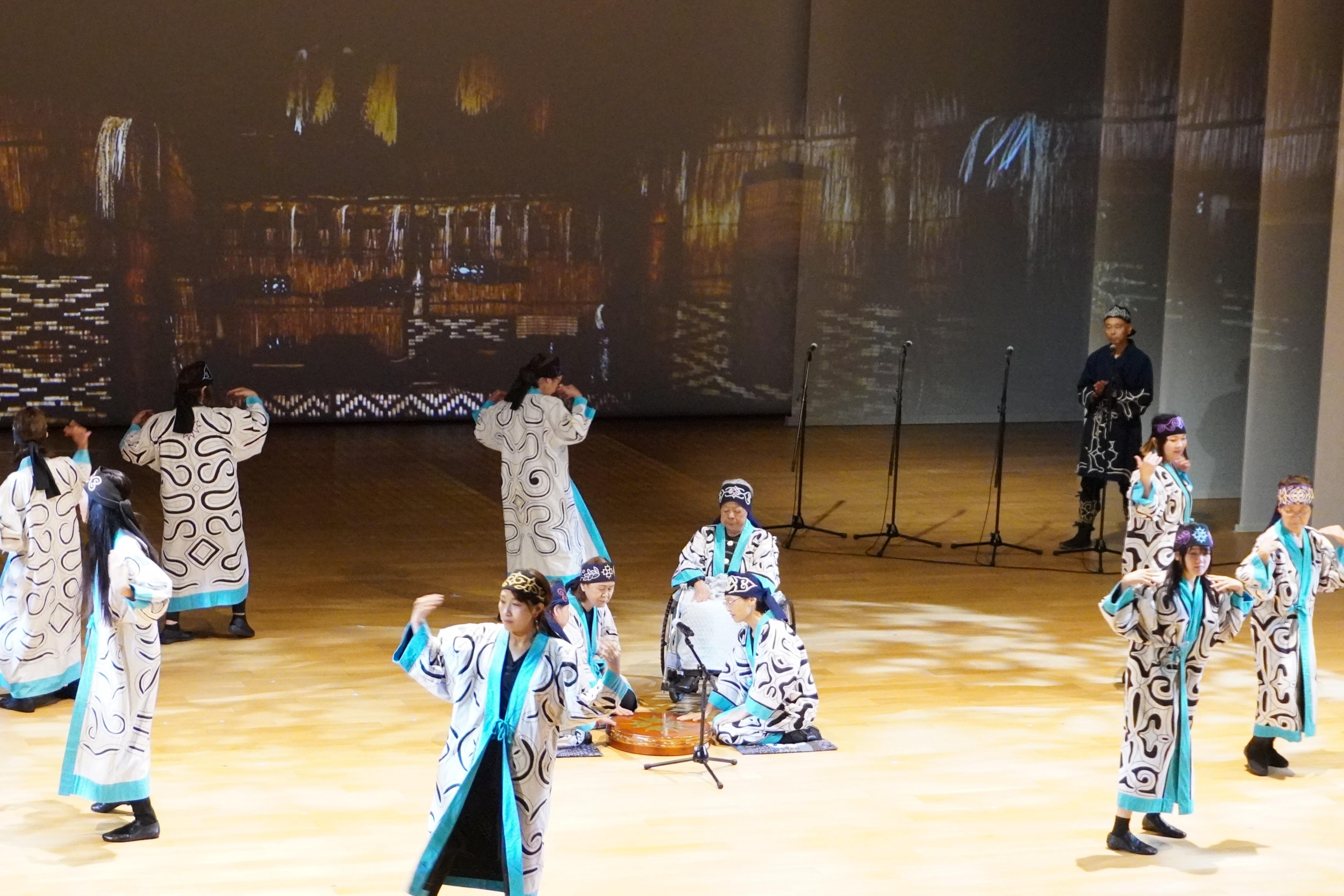 9月13日及び14日に新冠民族文化保存会の皆さんに、オンルイカやバッタリ イウタ ウポポ、ムックリ等6つの唄や踊りを披露していただきました。